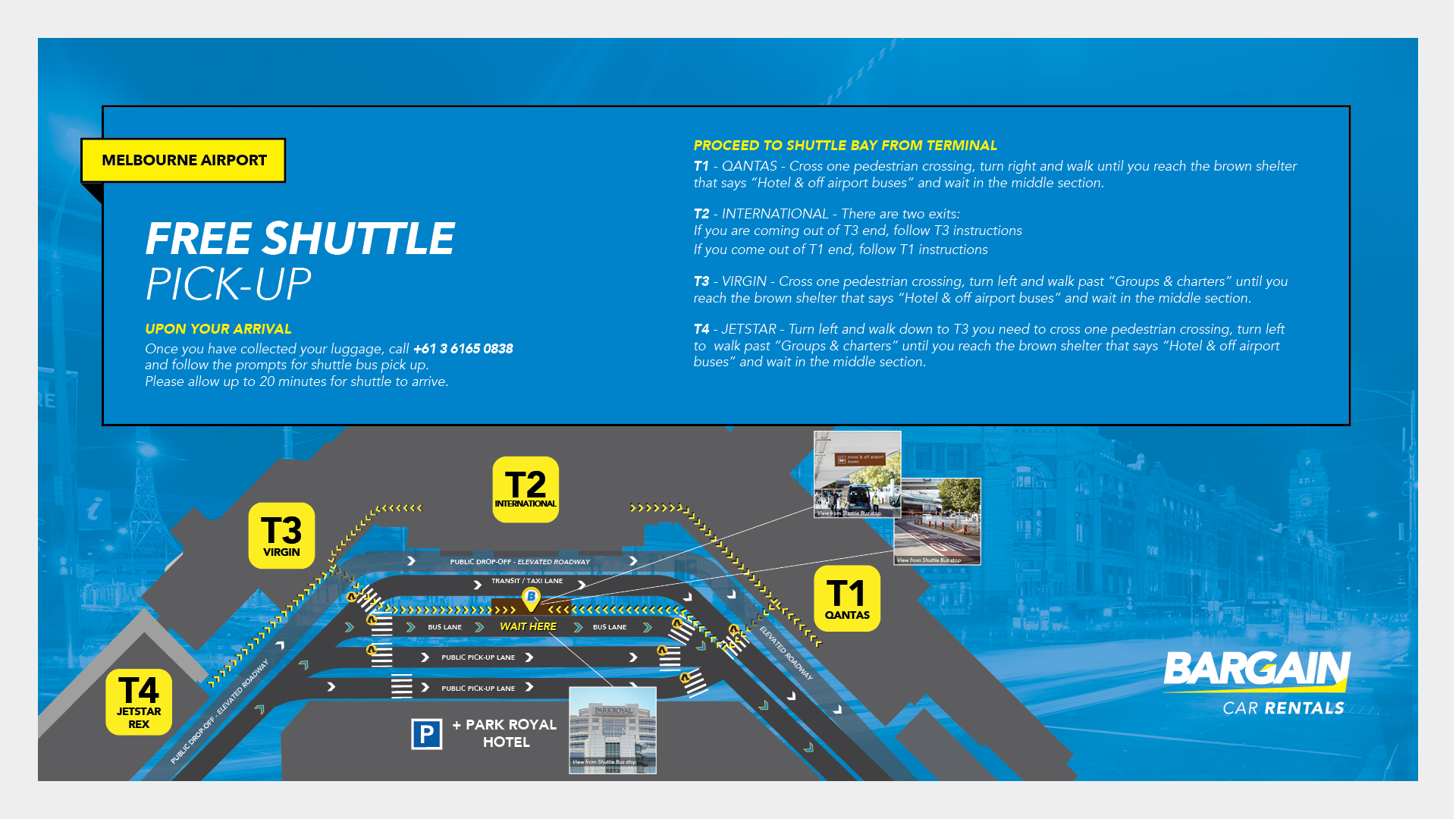 We operate the free shuttle service during business hours and up to 20 minutes before closing. See below for directions for your pickup area from each terminal.